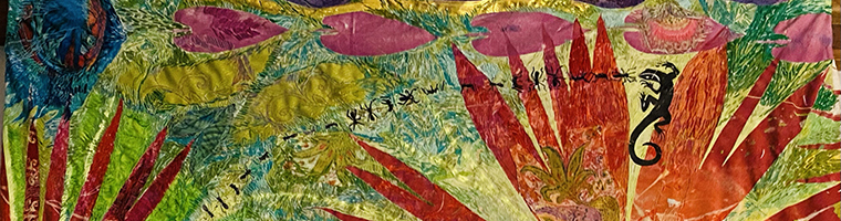 Hyde uses printmaking, collage, hand-stitching, and weaving to reflect the interconnectedness and chaos of nature. Her imagery moves from realistic and recognizable forms to more abstract and expressive shapes and patterns derived from plant life and jungle creatures. There is an energy to the work that echoes the cacophony and vivid color of the tropics. It’s a celebration of life, and also a warning: Hyde is reminding us that we humans are nature, too; that we are inextricably linked with our environment, and our survival depends on our appreciation and protection of our precious planet.
